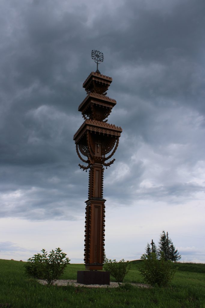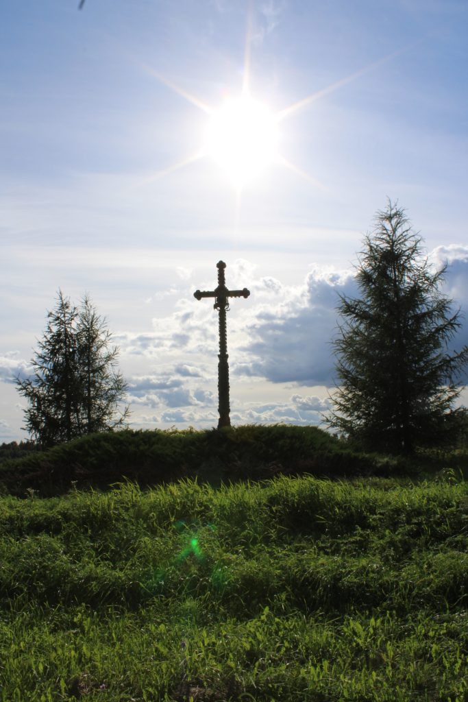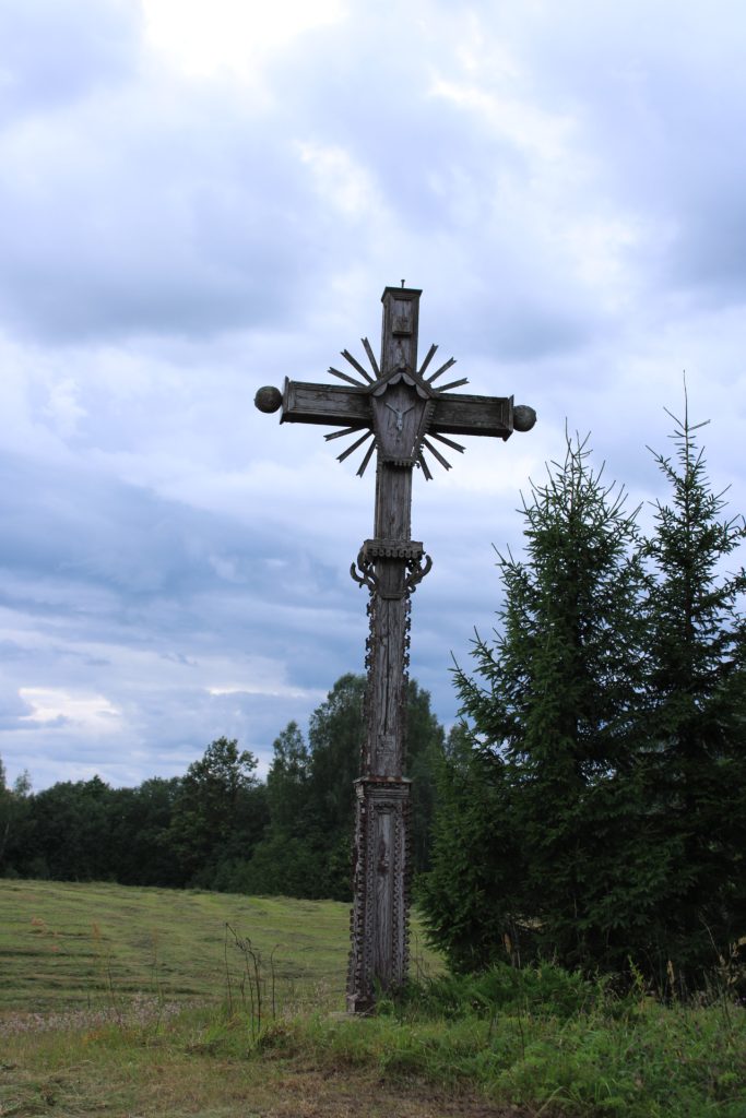 Prie senojo kaimo kelio stovėjo senasis kaimo kryžius, tačiau vienais metais kombainas jį nuvertė. Atstatyti jį apsiėmė A. Mačerauskas, nors, kaip sakė, nei medžio turėjo, nei buvo kryžių daręs. Apsiėmė ir padarė. Buvo 1991-ieji. Pastatė naująjį kryždarbą prie jau kito kelio, vedančio į Kazokiškį, sovietmečiu nutiestą melioratorių. Neapsiėjo kryžiaus gaminimo darbai ir be nelaimės: zeimeris pasigavo ąžuolo strypą, meistras lenkėsi išjungti įrenginio ir gavo tuo strypu į kaktą (gerai, kad tuo metu ir lenkėsi, nes būtų mirtinai užmušę). Visą kruviną vyrą aprišusi žmona buvo tiek susijaudinusi, kad niekaip vyro „Pobeda“ negalėjo nuvežti į ligoninę. Tada sužeistasis pats sėdo prie vairo ir kažkaip pasiekė Gintautą Lisauską („puskilometrį neatsimenu, kaip nuvažiavau“). Nors pastarasis buvo kiek pagėręs, surizikavo nuvežti kryždirbį tiesiai į Utenos ligoninės priimamąjį. Utena peršvietė, perrišo ir išvežė į Vilnių, Šv. Jokūbo ligoninėn. Ten išėmė sulūžusius kaulus, susiuvo, sakė, po metų galės plokštelę dėtis, bet gerai besijaučiąs ligonis taip ir neprisiruošė, juo labiau kad ir tas daktaras numirė.