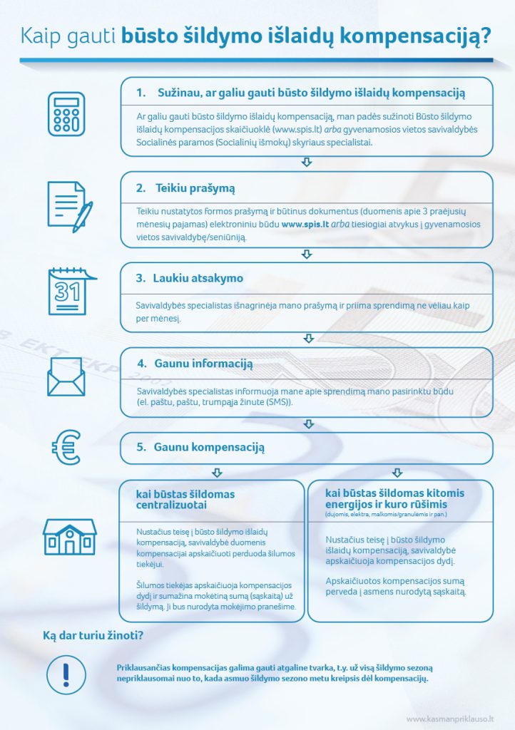 SVARBU! Būsto šildymo išlaidų kompensacija teikiama nepriklausomai nuo šildymo būdo, t. y. tiek būstą šildant centralizuotai, tiek kitos rūšies kuru (malkomis, dujomis, elektra ir pan.). Skiriant būsto šildymo ir vandens išlaidų kompensacijas ir (ar) socialinę pašalpą, vertinamas gyventojų nuosavybės teise turimas turtas.