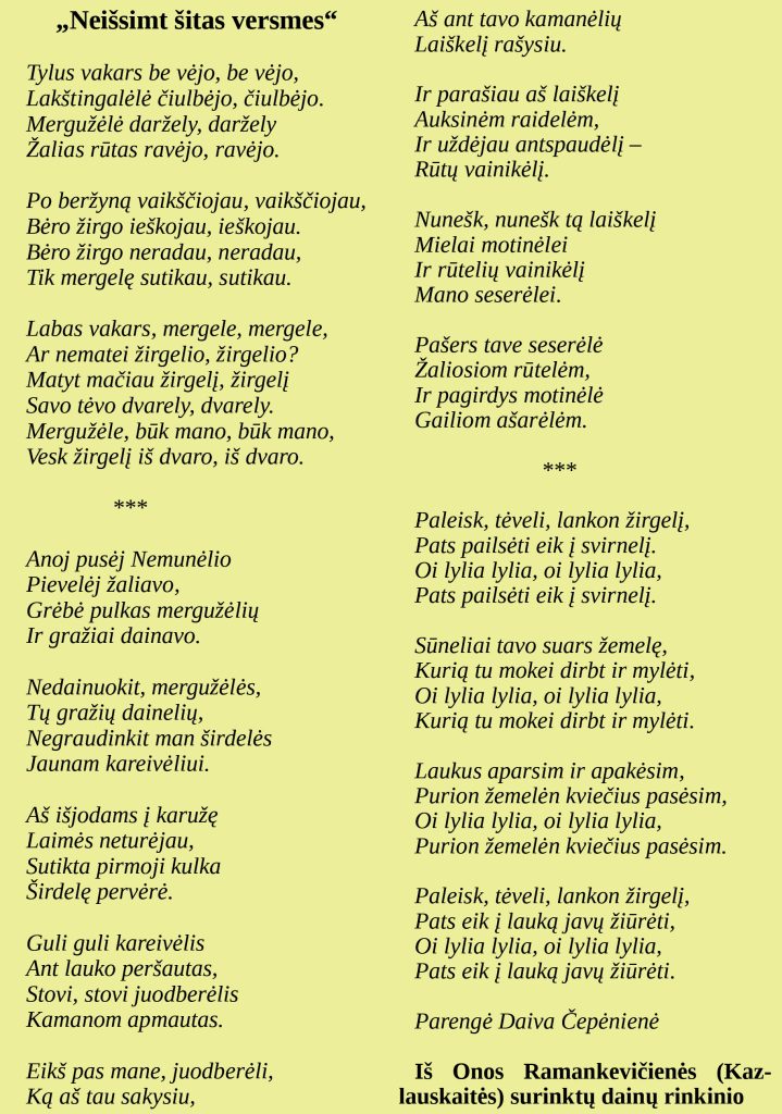 Pasak J. Juodelienės, kaip ežeras ją kažkuo stūmė tolyn, taip miškas traukte traukė. („Miške gimiau, augau ir ten gyvenu, o ežeras – už krūmų: nei aš ainu, nei anas man ten įdomu.“) Pašnekovė sau pritaikė Egidijaus Sipavičiaus dainos „Miškų dukra“ žodžius: Aš girių paslaptis pažįstu / Ir paukščių kalbą suprantu, / Juk aš miške nuo pat vaikystės / Klaidžius vilkotakius randu. Moteris sakė, kad viskas iš šios dainos jai tinka: „Aš visųlaik galvoju: „Nu, čia man, čia man, man čia dūšia, ajazau!“