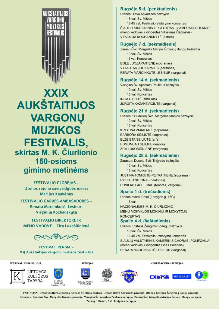 Žinoma, šiųmetėje festivalio programoje neskambės vien Čiurlionio kūriniai, tačiau jų tikrai bus. Festivalio atidarymo proga Utenoje vyks įspūdingas koncertas – pirmąkart svečiuosis Šiaulių miesto simfoninis orkestras „Camerata Solaris“, vadovaujamas maestro Vilhelmo Čepinskio, kuris patenka į geriausių pasaulio smuikininkų šimtuką. Uždarymo metu Utenos Kristaus Žengimo į dangų bažnyčioje festivalio ambasadorė vargonininkė Renata Marcinkutė-Lesieur koncertą užbaigs Čiurlionio kūriniu. Kituose koncertuose atlikėjai irgi įterps vieną kitą šio kompozitoriaus kūrinį.