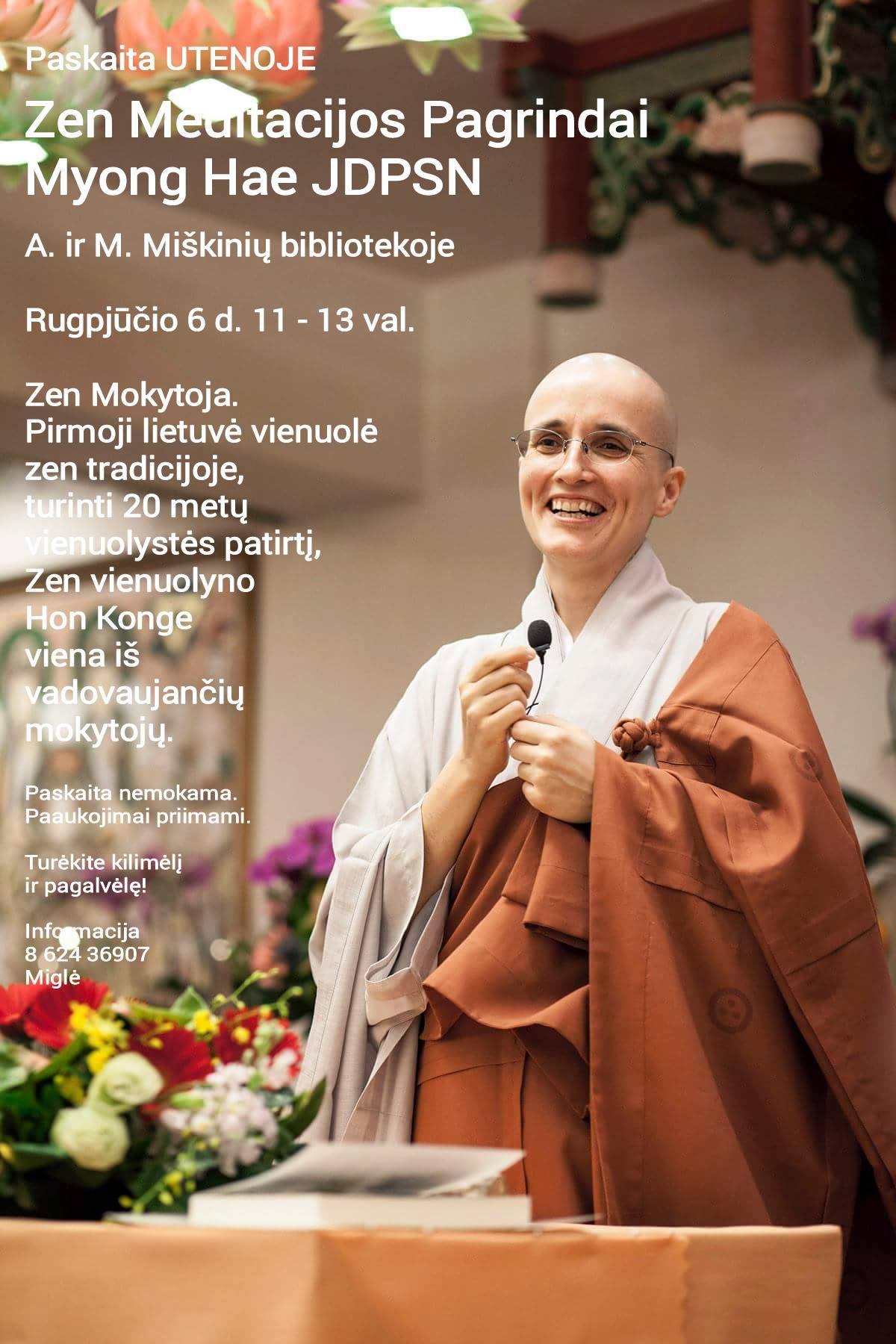 Rugpjūčio 6 dieną 11–13 val. Utenos A. ir M. Miškinių bibliotekoje vyks susitikimas su zen mokytoja. Pirmoji lietuvė vienuolė zen tradicijoje turi 20 metų vienuolystės patirtį, yra viena iš Zen vienuolyno Honkonge (Kinija) vadovaujančių mokytojų.