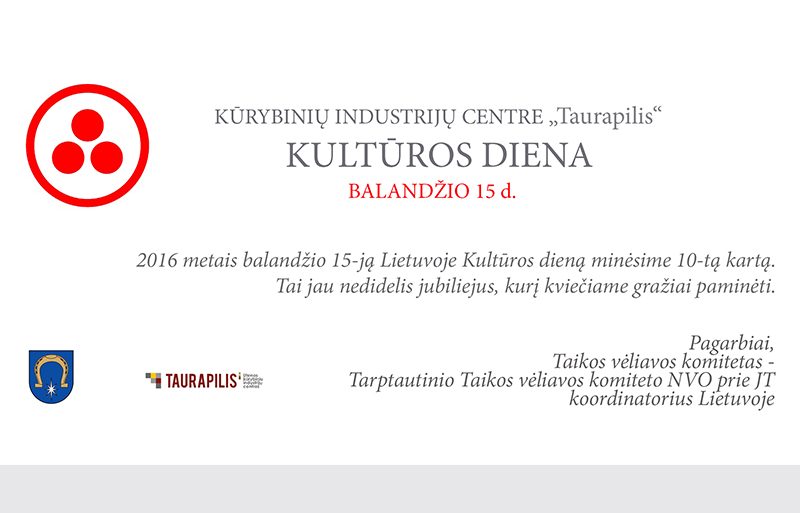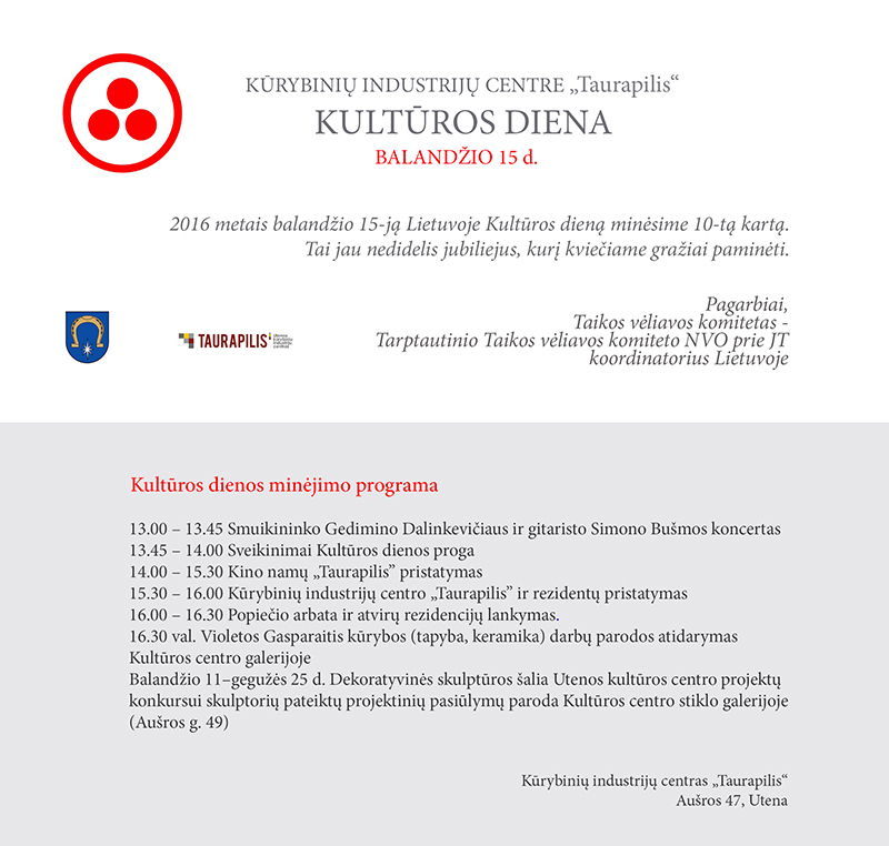 Balandžio 15 dieną šalyje bus minima Kultūros diena. Ta proga Utenoje, Kūrybinių industrijų centre „Taurapilis”, vyks nemažai įdomių renginių: smuikininko Gedimino Dalinkevičiaus ir gitaristo Simono Bušmos koncertas, sveikinimai, Kino namų „Taurapilis” pristatymas, Violetos Gasperaitis kūrybos darbų parodos atidarymas ir daugelis kitų Kultūros dienai skirtų akimirkų.