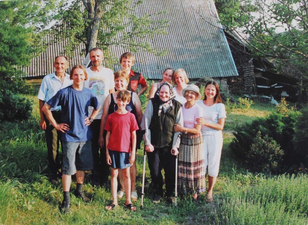 Marijona Bivainienė (pasirėmusi lazdomis) su giminaičiais savo sodyboje Šiaudiniškyje 2006 m. liepą