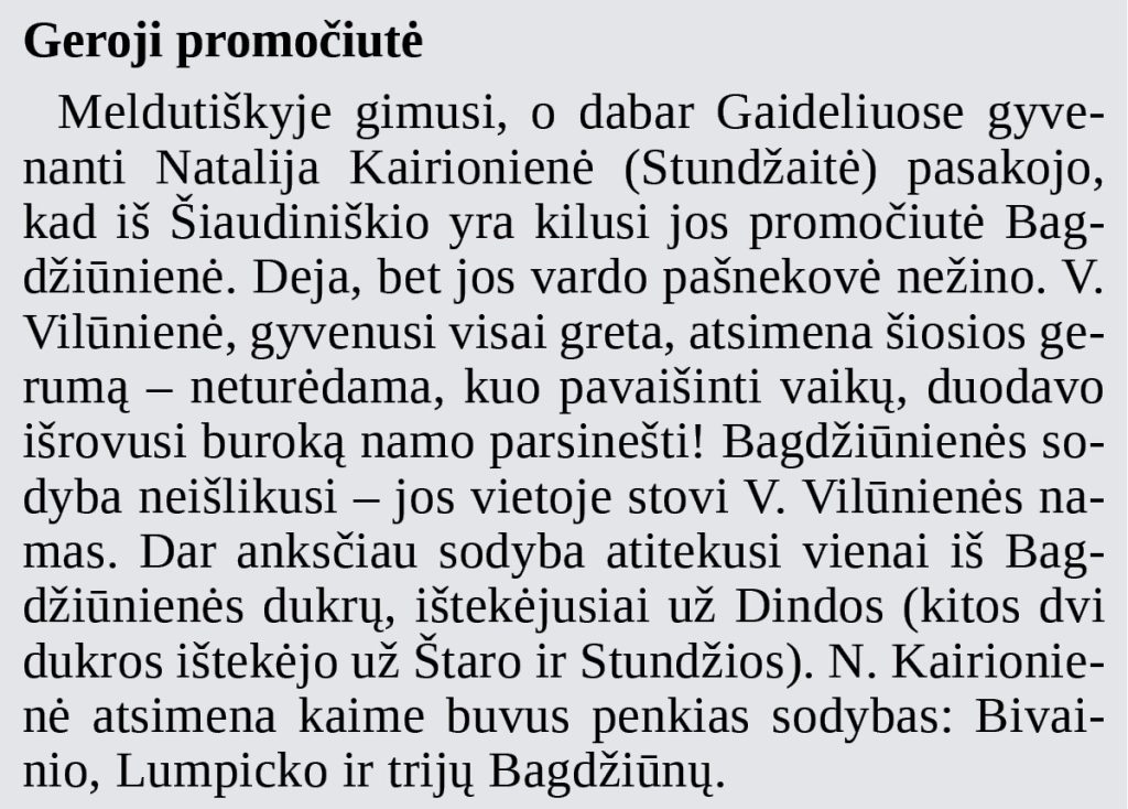 Kitas namas priklausė keturioms senmergėms Bagdžiūnaitėms: Viktorijai, Anastuoziai, Marcaliai, Grasildai. Šios moterys užaugino V. Bivainį, kuris gimė visai greta esančiame Meldutiškio kaime. Jį „užrodė“ į šį kaimą nutekėjusi Bagdžiūnaičių penktoji sesuo, kurios vardas lyg ir buvo Ona. Tiesa, iš pradžių pas keturias seseris buvo atsiųstas Vincento brolis Dominykas, tačiau šis teiškentė keletą dienų ir parbėgo namo. Bivainių šeimoje augo net penki sūnūs (Dominykas, Jonas, Kazimukas, Vincentas, Antanas), tad, sunkiai versdamiesi, tėvai greičiausiai vieną jų ir leido užauginti Šiaudiniškio senmergėms.
