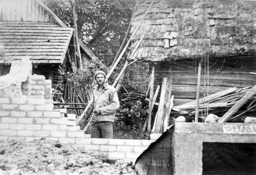 Jonas Bivainis 1990 m. gegužę tėviškėje stato mūrinį rūsį ir dirbtuvėles virš jo