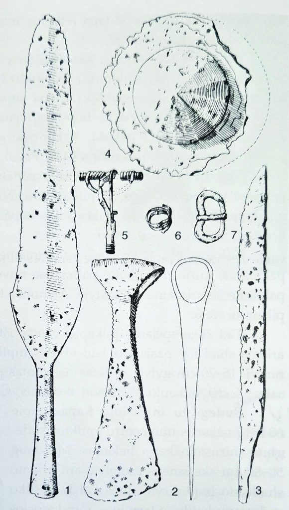 1 foto- Pilkapio Nr. 1 kapo radiniai: 1 – ietigalis, 2 – kovos kirvis, 3 – peilis, 4 – antskydis, 5 – segė, 6 – įvijinis žiedas, 7 – sagtis