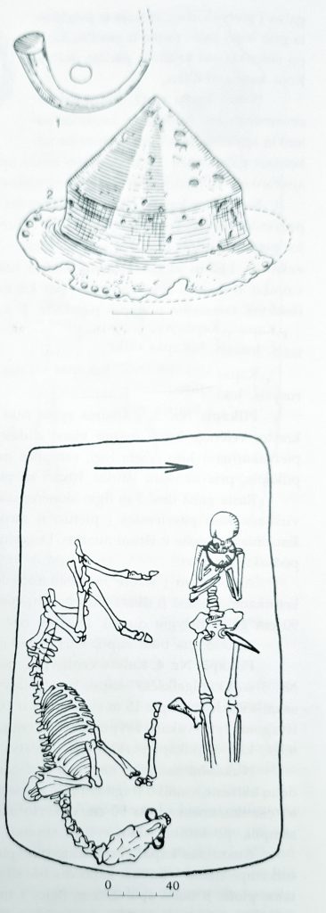 Šalia mirusiojo iš dešinės ant dešinio šono paguldytas žirgas – tai pat galva į pietvakarius, lygiagrečiai su mirusiuoju. Jo nugaros nareliai buvo vos 15–16 cm nuo žmogaus dešinės kojos pėdos kaulų.