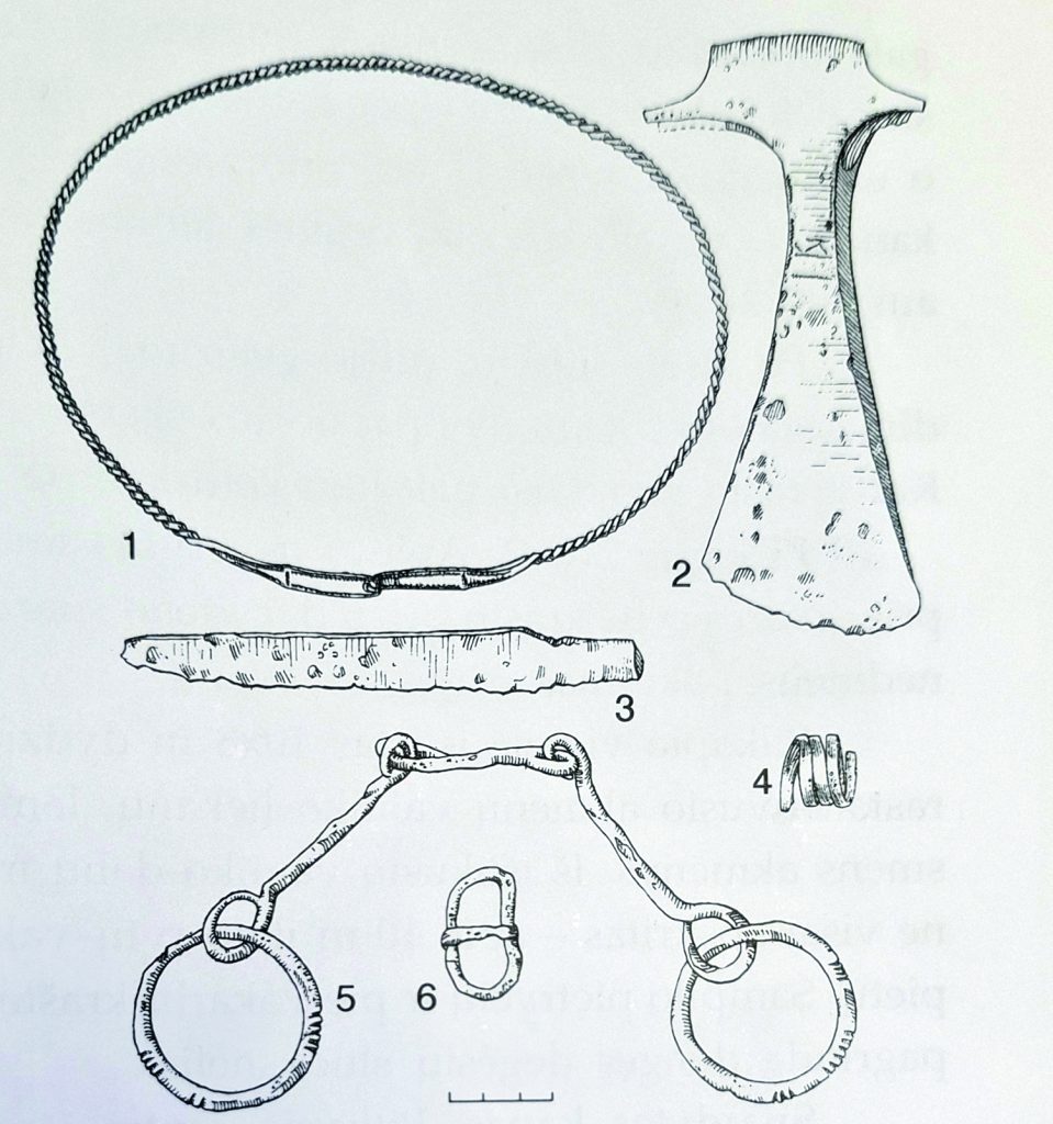 3 foto- Pilkapio Nr. 6 radiniai: 1 – antkaklė, 2 – kovos kirvis, 3 – peilis, 4 – įvijinis žiedas, 5 – žąslai, 6 – sagtis