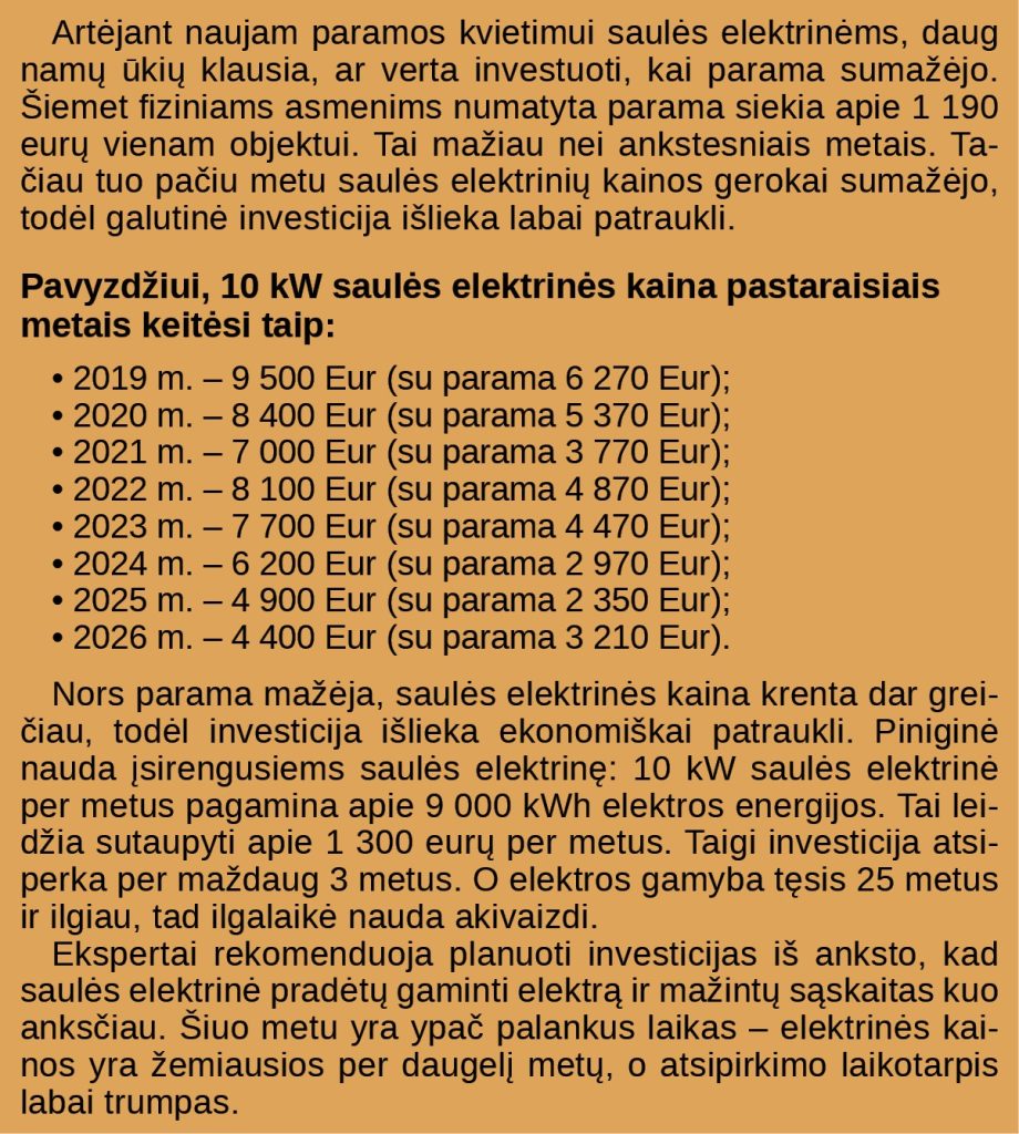 Artimiausia parama saulės elektrinėms planuojama balandžio mėnesį. Ją skirsto Aplinkos projektų valdymo agentūra (APVA). Iš tiesų, gauti paramą nėra sudėtinga, jei dokumentai sutvarkyti tinkamai. Svarbiausia pasirinkti patikimą, ilgaamžę įrangą ir patyrusius montuotojus, kad elektrinė būtų įrengta taisyklingai. Tuomet sistema saugiai veiks ir bus sklandžiai priduota eksploatuoti.